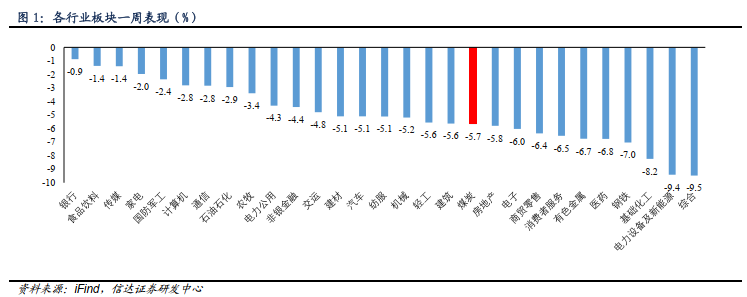 ⚫ 本周煤炭板块下跌5.67%,表现劣于大盘;本周沪深300下跌3.77%到4453.61;涨跌幅前三的行业分别是银行(-0.87%)、食品饮料(-1.36%)、传媒(-1.39%)。