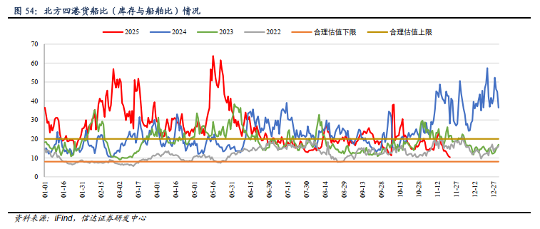 ⚫ 截至11月21日,环渤海地区四大港口(秦皇岛港、黄骅港、曹妃甸港、京唐港东港)的库存为1533.3万吨(周环比增加96.70万吨),锚地船舶数为94艘(周环比下降25艘),货船比(库存与船舶比)为16.3,周环比增加4.24。
