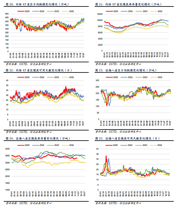 ⚫ 内陆17省:截至11月20日,内陆十七省煤炭库存较上周上升89.10万吨,周环比增加0.89%;日耗较上周上升14.70万吨/日,周环比增加4.37%;可用天数较上周下降1.00天。