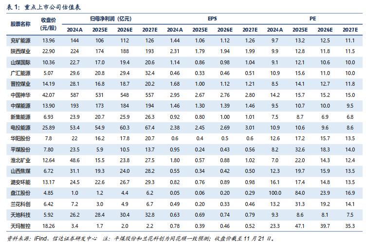 投资建议:结合我们对能源产能周期的研判,煤炭供给瓶颈约束有望持续至“十五五”,仍需新规划建设一批优质产能以保障我国中长期能源煤炭需求。在煤炭布局加速西移、资源费与吨煤投资大幅提升背景下,国内经济开发刚性成本和国外进口煤成本的抬升均有望支撑煤价中枢保持高位。当前,煤炭板块仍属高业绩、高现金、高分红资产,行业仍具高景气、长周期、高壁垒特征,叠加宏观经济底部向好,央企市值管理新规落地,煤炭央国企资产注入工作已然开启,以及一二级市场估值倒挂,愈加凸显优质煤炭公司盈利与成长的高确定性。煤炭板块向下调整有高股息安全边际支撑,向上弹性有后续煤价上涨预期催化,我们继续全面看多“或跃在渊”的煤炭板块。自上而下重点关注:一是经营稳定、业绩稳健的中国神华、陕西煤业、中煤能源、新集能源;二是弹性较大的兖矿能源、电投能源、广汇能源、甘肃能化等;三是全球资源特殊稀缺的优质冶金煤公司淮北矿业、潞安环能、盘江股份等;同时建议关注兖煤澳大利亚、天地科技、兰花科创、上海能源、天玛智控等。