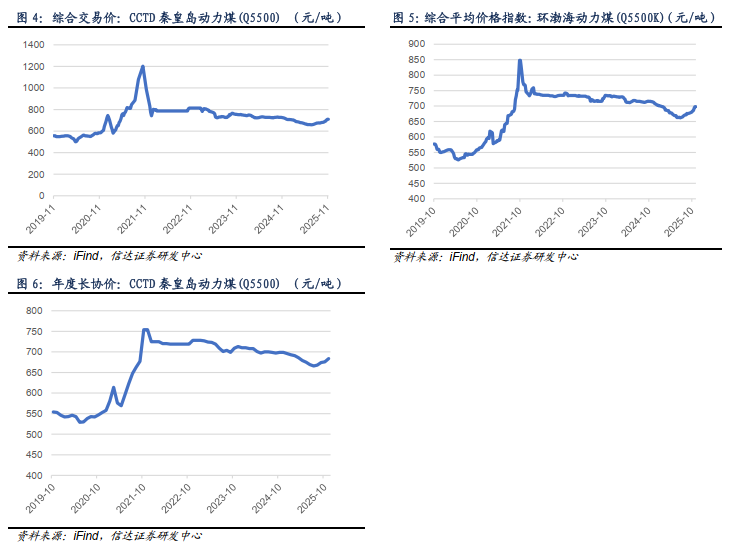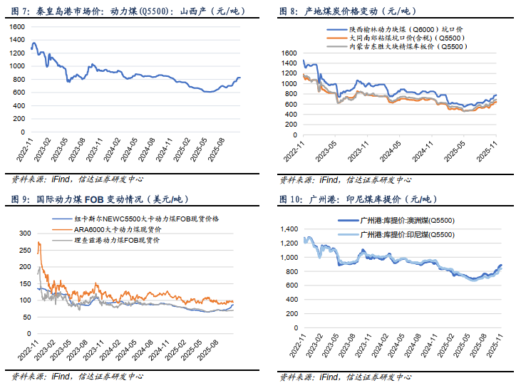 我们认为,当前正处在煤炭经济新一轮周期上行的初期,基本面、政策面共振,现阶段逢低配置煤炭板块正当时。本周基本面变化:供给方面,本周样本动力煤矿井产能利用率为91.5%(+0.3个百分点),样本炼焦煤矿井产能利用率为86.94%(+0.66个百分点)。需求方面,内陆17省日耗周环比上升14.70万吨/日(+4.37%),沿海8省日耗周环比上升7.50万吨/日(+4.18%)。非电需求方面,化工耗煤周环比上升8.76万吨/日(+1.24%);钢铁高炉开工率为82.19%(-0.62个百分点);水泥熟料产能利用率为39.3%(-19.92个百分点)。价格方面,本周秦港Q5500煤价收报827元/吨(持平);京唐港主焦煤价格收报1790元/吨(-40元/吨)。值得注意的是,本周港口煤炭价格保持平稳运行,产地煤炭价格周环比回升。产地方面,受供给偏紧影响,产地煤炭价格支撑性较强,部分前期小幅跌价的煤矿开始上调。港口方面,受下游需求尚未完全启动、贸易商看好后市挺价等因素影响,港口煤价平稳运行。展望后市,随着冬季深入,电厂日耗季节性爬坡将推动市场情绪转向乐观,新一轮由需求驱动煤价上涨的行情蓄势待发。我们继续看多煤炭价格和板块上涨,建议投资者坚定逢低布局。煤炭配置核心观点:当下,我们信达能源团队一直提出的煤炭产能短缺的底层投资逻辑未变(短期供需基本平衡,中长期仍存缺口)、煤价底部确立并中枢站上新平台的趋势未变、优质煤企高盈利&高现金流&高ROE&高分红的核心资产属性未变(ROE为10-15%,股息率>5%,新增中期分红)、以及煤炭资产相对低估且估值整体性仍有望提升的判断未变(一级矿权市场高溢价,多数公司PB约1倍),且公募基金煤炭持仓处于低配状态。基于此,煤炭板块配置策略不可忽视红利特性,又要把握顺周期弹性。即,煤炭板块向下回调有高股息边际支撑,向上弹性有后续煤价上涨预期催化,叠加伴随煤价底部确认有望带来估值重塑且具有较大提升空间,煤炭资产仍是具有性价比、高胜率和高赔率资产。当前,煤炭板块迎来较大回调,再次出现较高性价比的底部机会,反观煤炭企业不断实施增持、回购彰显发展信心。我们继续坚定看多煤炭,再度提示逢低配置。总体上,能源大通胀背景下,我们认为未来3-5年煤炭供需偏紧的格局仍未改变,优质煤炭企业依然具有高壁垒、高现金、高分红、高股息的属性,叠加煤价筑底推动板块估值重塑,板块投资攻守兼备且具有高性价比,短期板块回调后已凸显出较高的投资价值,再度建议重点关注现阶段煤炭的配置机遇。