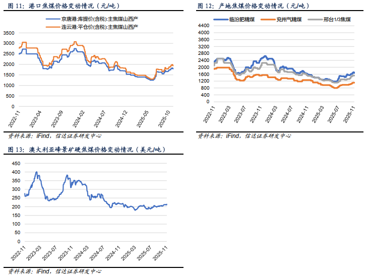 炼焦煤价格方面:本周京唐港价格周环比下降,产地临汾价格周环比下降。港口炼焦煤:截至11月21日,京唐港山西产主焦煤库提价(含税)1790元/吨,周下跌40元/吨;连云港山西产主焦煤平仓价(含税)1942元/吨,周下跌47元/吨。产地炼焦煤:截至11月21日,临汾肥精煤车板价(含税)1670.0元/吨,周环比下跌40.0元/吨;兖州气精煤车板价1110.0元/吨,周环比持平;邢台1/3焦精煤车板价1520.0元/吨,周环比持平。国际炼焦煤:截至11月21日,澳大利亚峰景煤矿硬焦煤中国到岸价214.2美元/吨,周环比上涨3.3美元/吨。