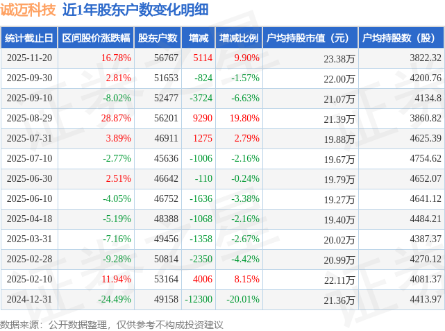 从股价来看,2025年9月30日至2025年11月20日,诚迈科技区间涨幅为16.78%,在此期间股东户数增加5114.0户,增幅为9.9%。