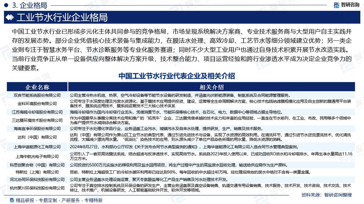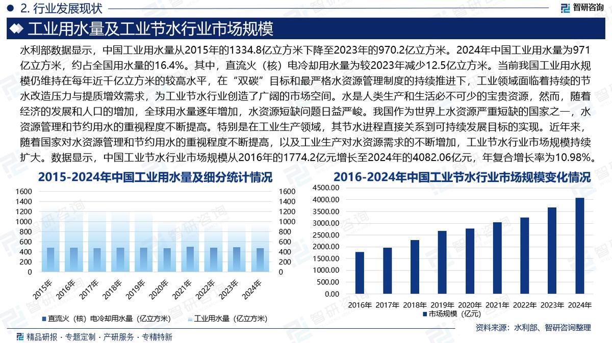工业节水是指通过技术性与管理性措施提高用水效率、减少水损失及开发替代水资源的综合体系。技术性措施包含循环用水系统、废水回用及零排放技术,重点推广高效换热设备、空气冷却技术,并通过改革生产工艺实施省水新工艺、无污染技术及节水器具;管理性措施涵盖政策法规制定、用水计划优化及监测系统建设,配套发展海水淡化、矿井水利用等非常规水源技术。工业节水主要包括工业用水重复利用、冷却节水技术、洗涤节水技术、给水和废水处理、非常规水资源利用、快速堵漏修复技术、计量管理和重点节水工艺。水是人类生产和生活必不可少的宝贵资源,然而,随着经济的发展和人口的增加,全球用水量逐年增加,水资源短缺问题日益严峻。我国作为世界上水资源严重短缺的国家之一,水资源管理和节约用水的重视程度不断提高。特别是在工业生产领域,其节水进程直接关系到可持续发展目标的实现。近年来,随着国家对水资源管理和节约用水的重视程度不断提高,以及工业生产对水资源需求的不断增加,工业节水行业市场规模持续扩大。数据显示,中国工业节水行业市场规模从2016年的1774.2亿元增长至2024年的4082.06亿元,年复合增长率为10.98%。未来,随着节水技术的持续创新与智能化水平的全面提升,节水装备与产品的性能、效率及可靠性将实现显著跃升,从而为工业节水市场规模的持续扩张提供核心驱动力。中国工业节水行业已形成多元化主体共同参与的竞争格局,市场呈现系统解决方案商、专业技术服务商与大型用户自主实践并存的发展态势。部分企业凭借核心技术装备与集成能力,在膜法水处理、高效冷却、工艺节水等细分领域建立优势;另一类企业则专注于智慧水务平台、节水诊断服务等专业化服务赛道;同时不少大型工业用户也通过自身技术积累开展节水改造实践。当前行业竞争正从单一设备供应向整体解决方案升级,技术整合能力、项目运营经验和跨行业渗透水平成为决定企业竞争力的关键要素。目前,中国工业节水行业代表企业主要包括双良节能系统股份有限公司、金科环境股份有限公司、江苏海鸥冷却塔股份有限公司、三达膜环境技术股份有限公司、海南宜净环保股份有限公司、达利(中国)有限公司、上海华谊能源化工有限公司、上海中航光电子有限公司、科思创聚合物(中国)有限公司、特斯拉(上海)有限公司、河北协同环保科技股份有限公司、杭州聚川环保科技股份有限公司等。