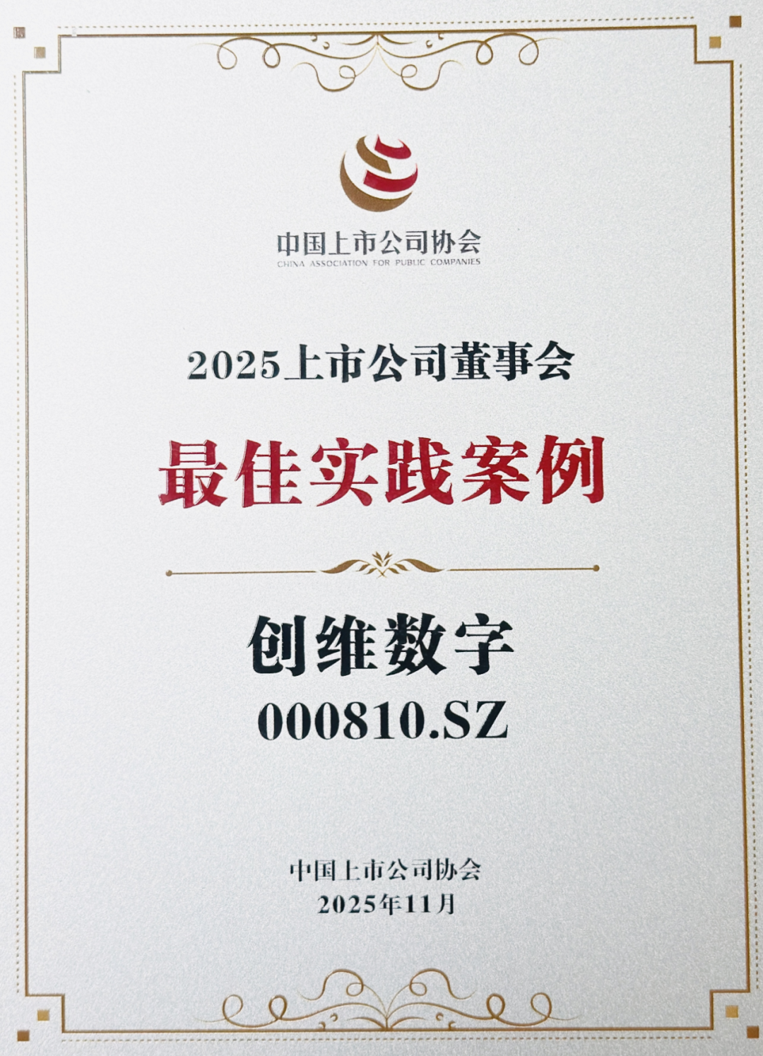 11月18日,中国上市公司协会第三届理事会第六次会议揭晓上市公司董事会“最佳实践案例”、“优秀实践案例”、“典型实践案例”的评选结果,经初审、专家委员会评审、诚信核查等环节,创维数字(股票代码:000810.SZ)从2000余家参评上市公司中脱颖而出,获评中国上市公司协会“2025上市公司董事会最佳实践案例”,充分体现资本市场对创维数字公司治理质量的高度肯定。