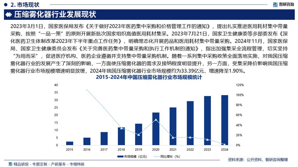 压缩雾化器也叫射流式雾化,是一种借助压缩空气形成高速气流,将液态药物雾化成微小雾滴的医疗设备。2024年11月,国家医保局、国家卫生健康委员会发布《关于完善医药集中带量采购和执行工作机制的通知》,指出加强集采全流程管理,切实坚持“为用而采”,促进医疗机构、医药企业遵循并支持集中带量采购机制。随着一系列集中采购政策全面落地实施,对我国压缩雾化器行业的发展产生了深刻的影响,一方面使压缩雾化器的需求及接纳程度明显提升,另一方面,受集采降价影响我国压缩雾化器行业市场规模增速明显放缓,2024年我国压缩雾化器行业市场规模约为33.39亿元,增速降至1.90%。