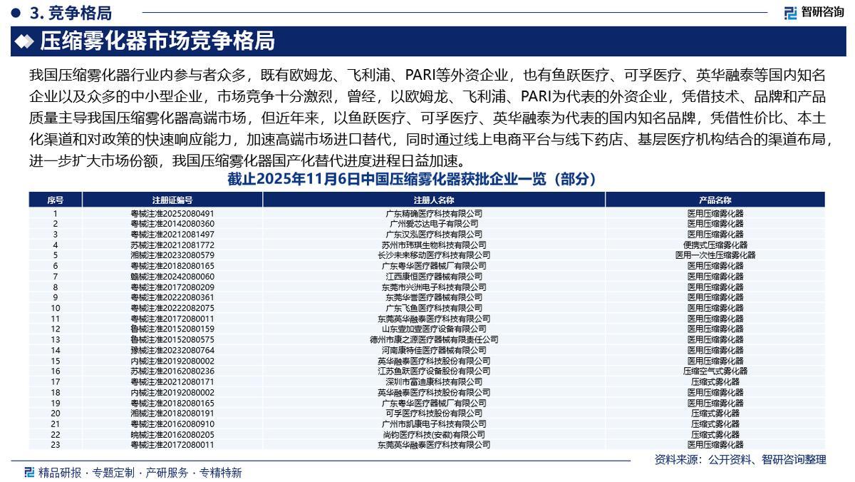市场竞争格局:我国压缩雾化器行业内参与者众多,既有欧姆龙、飞利浦、PARI等外资企业,也有鱼跃医疗、可孚医疗、英华融泰等国内知名企业以及众多的中小型企业,市场竞争十分激烈,曾经,以欧姆龙、飞利浦、PARI为代表的外资企业,凭借技术、品牌和产品质量主导我国压缩雾化器高端市场,但近年来,以鱼跃医疗、可孚医疗、英华融泰为代表的国内知名品牌,凭借性价比、本土化渠道和对政策的快速响应能力,加速高端市场进口替代,同时通过线上电商平台与线下药店、基层医疗机构结合的渠道布局,进一步扩大市场份额,我国压缩雾化器国产化替代进度进程日益加速。