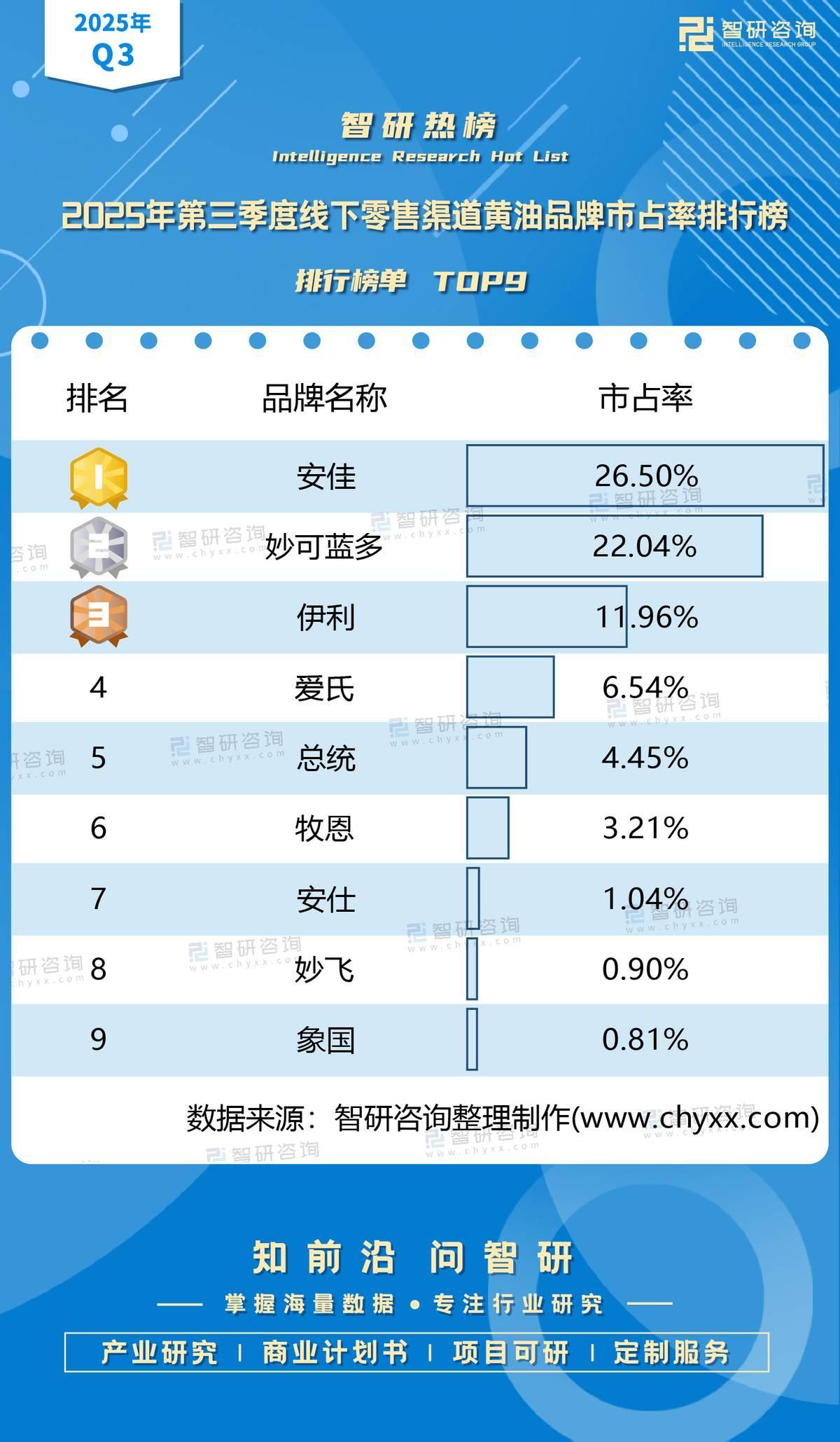 导语:近日,2025年第三季度线下零售渠道黄油品牌市占率分析简报正式发布。数据显示,安佳凭借其多规格黄油产品矩阵,精准把握现代家庭便捷需求,在线下零售渠道市占率位居榜首。本次品牌市占率榜单是智研咨询基于全国线下零售渠道真实销售数据,测算得出的,覆盖主流黄油品牌,为行业提供了权威的市场参考。