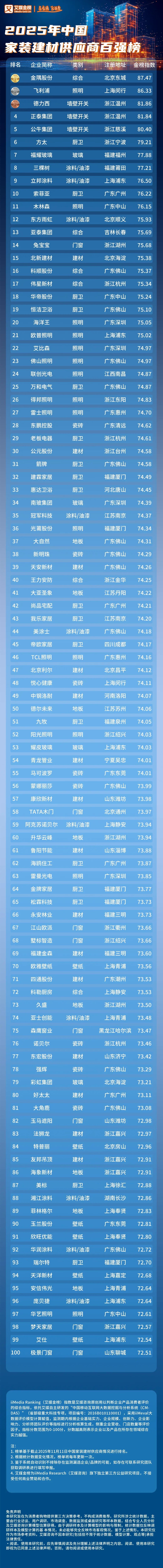 iiMedia Ranking(艾媒金榜)是艾媒咨询旗下中国新消费品牌评价机构,为消费者提供客观的品牌信息及购物消费指南。iiMedia Ranking(艾媒金榜)最新发布《2025年中国家装建材供应商百强榜》,金榜指数是艾媒咨询原创用以判断企业产品消费者评价的综合指标,依托艾媒自主研发的“中国移动互联网大数据挖掘与分析系统(CMDAS)”(省部级重大科技专项,项目编号:2016B010110001),采用iiMeval大数据评价模型计算赋值,监测期内根据企业基础实力、企业规模、创新力、企业影响力、分析师团队评价等指标进行分析核算生成。指标分数范围为0-100分,分数越高则表示企业以及产品在所在领域综合实力越强。