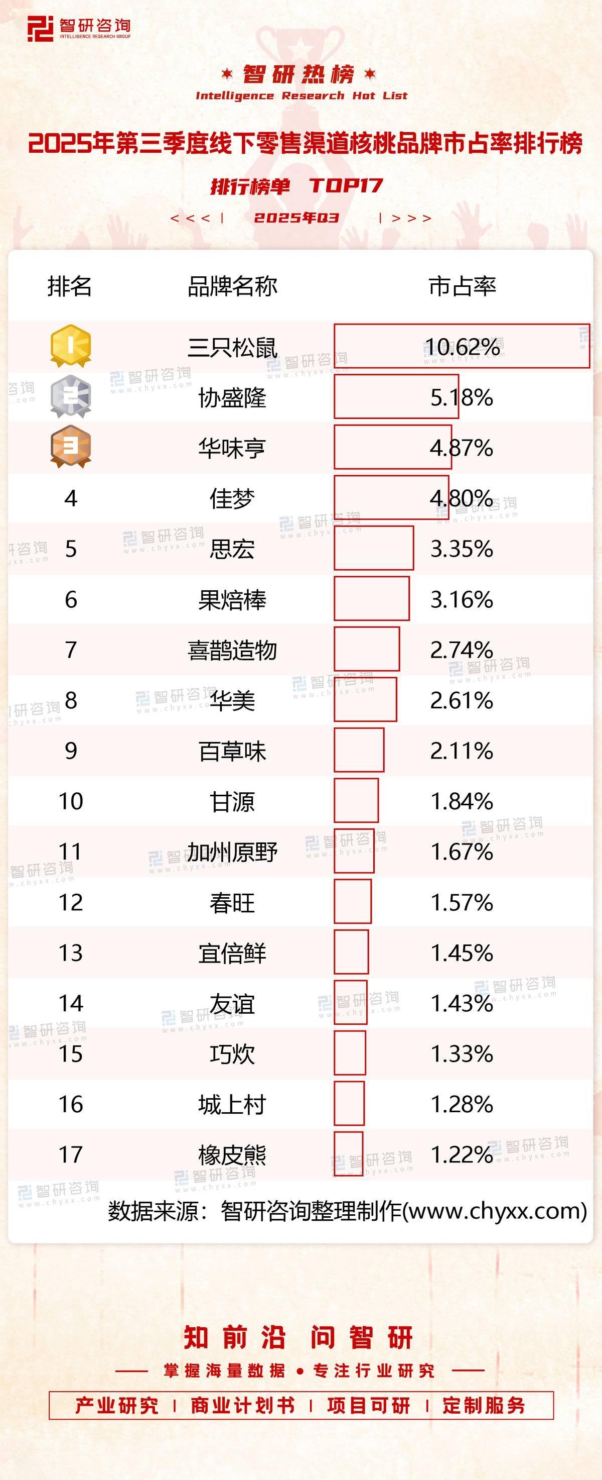 导语:近日,2025年第三季度线下零售渠道核桃品牌市占率分析简报正式发布。数据显示,三只松鼠凭借其全渠道布局与品牌年轻化战略,在核桃品类中以显著优势保持领先地位。本次品牌市占率榜单是智研咨询基于全国线下零售渠道真实销售数据,测算得出的,覆盖主流核桃品牌,为行业提供了权威的市场参考。