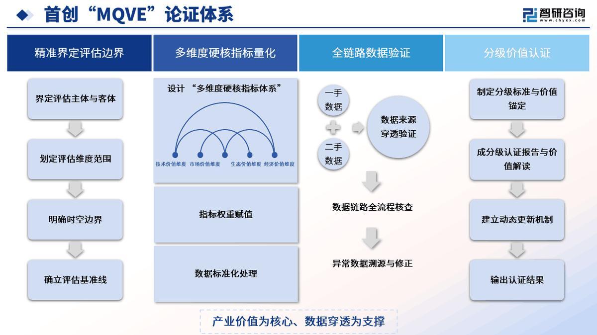 智研咨询作为中国领先的第三方市场地位认证机构,凭借 17 年产业研究沉淀与全链路数据验证体系,推出批量市场地位认证服务,专为大型集团、品牌企业、行业机构提供规模化、标准化的权威认证解决方案。市场地位认证采用智研咨询首创“MQVE”(Multi-dimensional Quantification, Value Anchoring & Ecological Verification)论证体系,是一套以“产业价值为核心、数据穿透为支撑”的市场地位认证方法论,其核心逻辑是通过“精准界定评估边界→多维度硬核指标量化→全链路数据验证→分级价值认证”的闭环设计,打破传统“规模唯上”的单一评估局限,客观判定企业在产业生态中的真实地位。