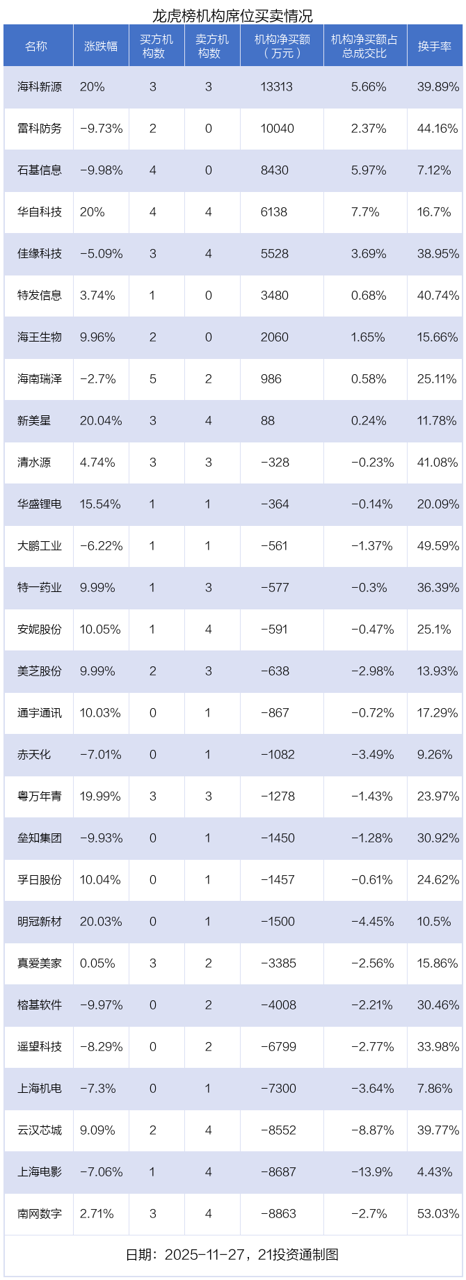 11月27日,上证指数上涨0.29%,深证成指下跌0.25%,创业板指下跌0.44%。盘后龙虎榜数据显示,共有48只个股因当日异动登上龙虎榜,资金净流入最多的是海科新源(301292.SZ),达2.14亿元。