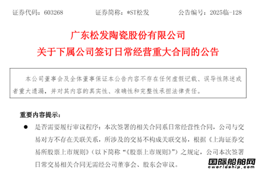 11月27日晚间,广东松发陶瓷股份有限公司发布公告称,下属公司恒力造船(大连)有限公司一批船舶建造合同签约生效,签约对方为EPS旗下单船公司,合同标的包括6艘30.6万吨超大型原油运输船(VLCC)、2艘15.7万载重吨LNG双燃料原油船和4艘6000TEU集装箱船,将在2027年下半年至2028年相继交付。本次标的合同金额合计约11-16亿美元(约合人民币77.88-113.29亿元)。