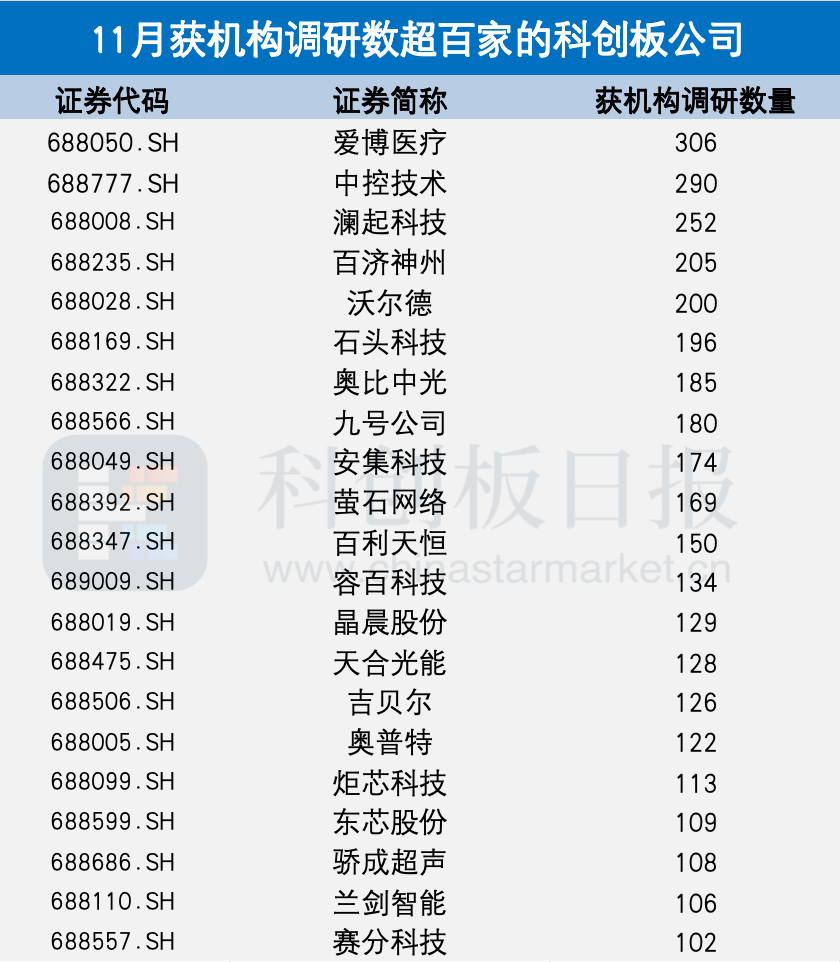 《科创板日报》12月1日讯(记者黄修眉)财联社星矿数据统计显示,11月1日至30日,共287家科创板公司获得机构调研,有21家公司获得机构调研数量超百家。