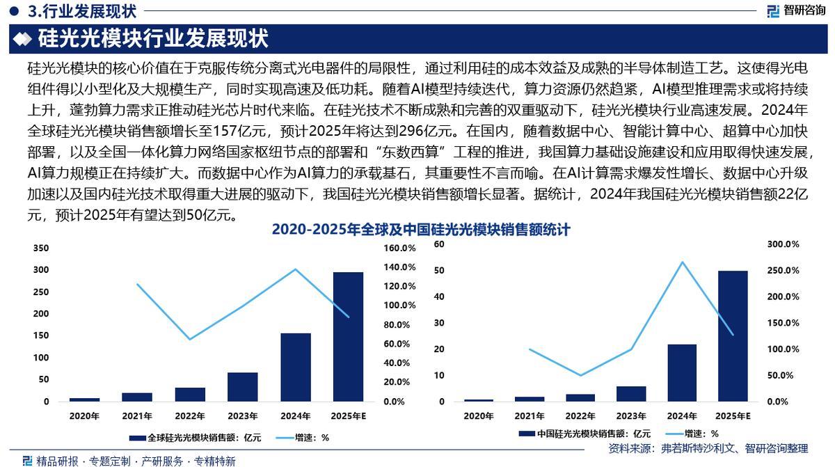 全球市场规模:近年来,随着AI模型持续迭代,算力资源仍然趋紧,AI模型推理需求或将持续上升,蓬勃算力需求正推动硅光芯片时代来临。在硅光技术不断成熟和完善的双重驱动下,硅光光模块行业高速发展。2024年全球硅光光模块销售额增长至157亿元,预计2025年将达到296亿元。