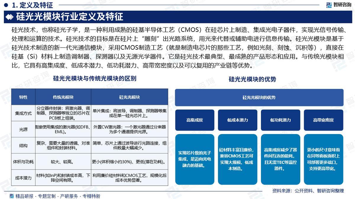 行业定义及特征:硅光光模块,是基于硅光技术制造的新一代光通信模块。它是硅光技术最典型、最成熟的产品形态和应用。与传统光模块相比,它具有高集成度、低成本潜力、低功耗潜力、高带宽密度以及可以复用的产业链等优势。