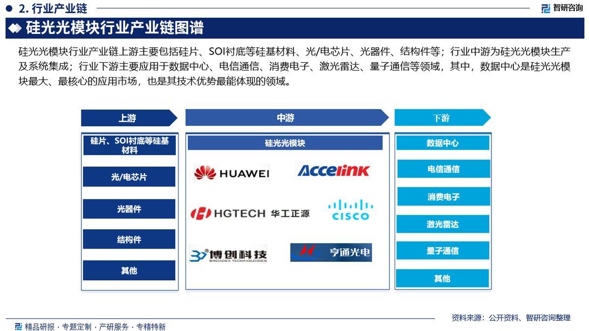 产业链核心节点:硅光光模块行业产业链上游主要包括硅片、SOI衬底等硅基材料、光/电芯片、光器件、结构件等;行业中游为硅光光模块生产及系统集成;行业下游主要应用于数据中心、电信通信、消费电子、激光雷达、量子通信等领域,其中,数据中心是硅光光模块最大、最核心的应用市场,也是其技术优势最能体现的领域。