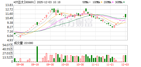 *ST亚太盘中涨停,已连收7个涨停板,截至9:25,该股报11.51元,换手率0.25%,成交量80.08万股,成交金额921.72万元,涨停板封单金额为5799.20万元。连续涨停期间,该股累计上涨40.71%,累计换手率为12.82%。最新A股总市值达37.21亿元。