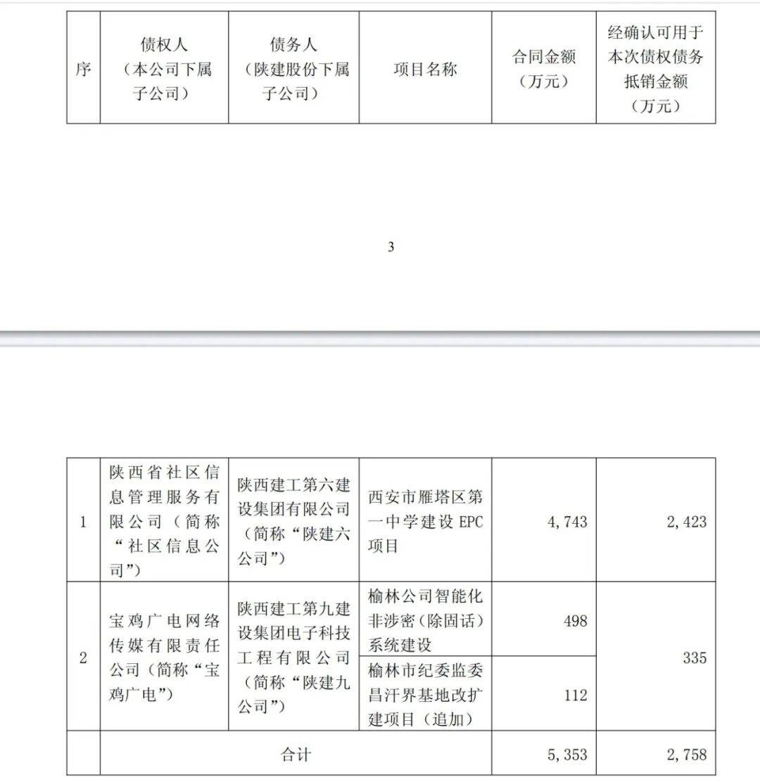 即:以本公司下属子公司对陕建股份下属子公司应收工程款2,758万元,等额冲抵广电融媒体集团对陕建股份部分债务,同步等额冲抵本公司对广电融媒体集团部分借款。