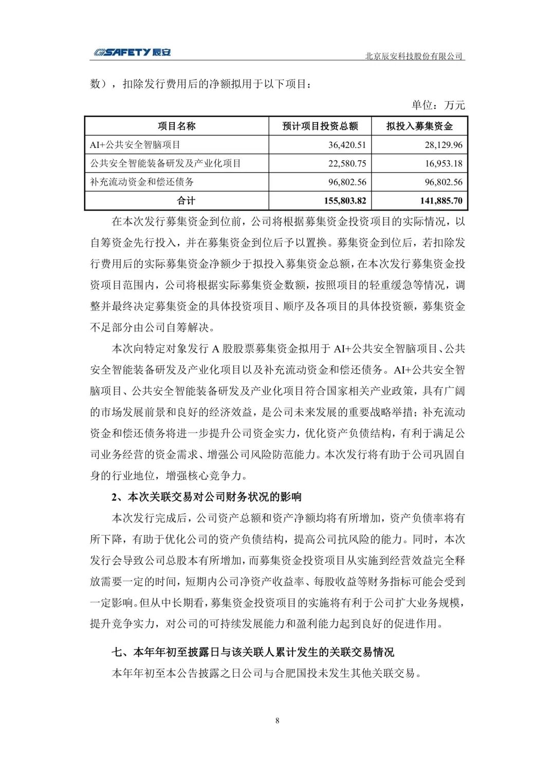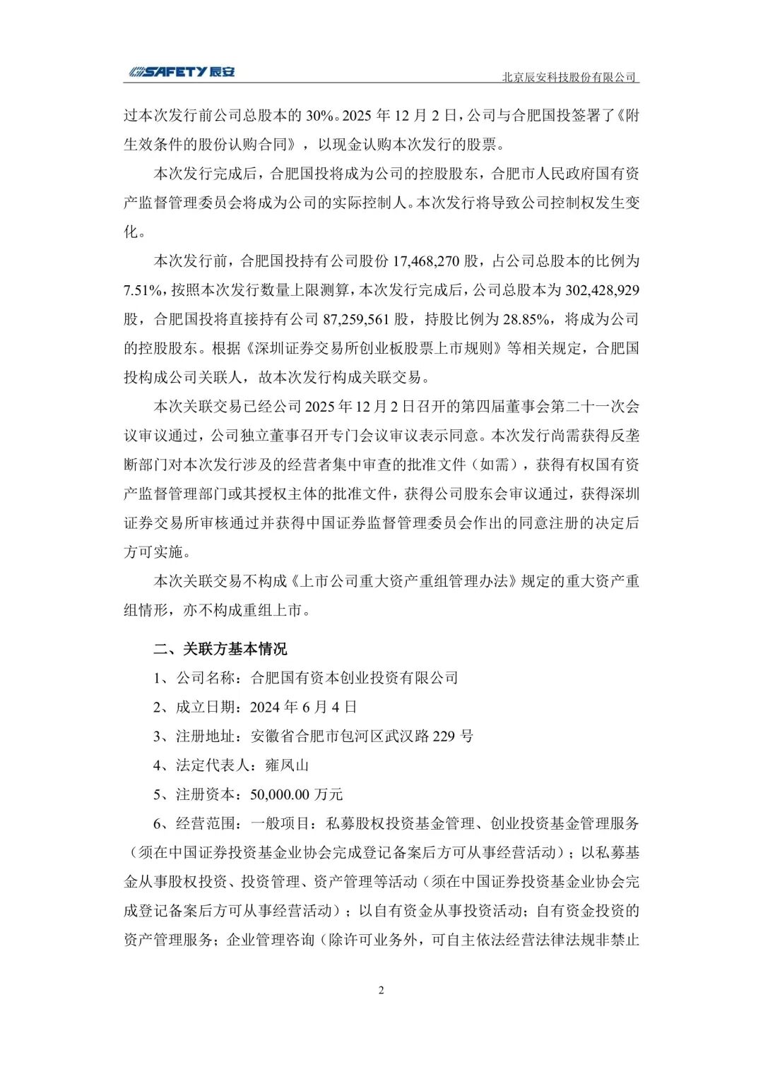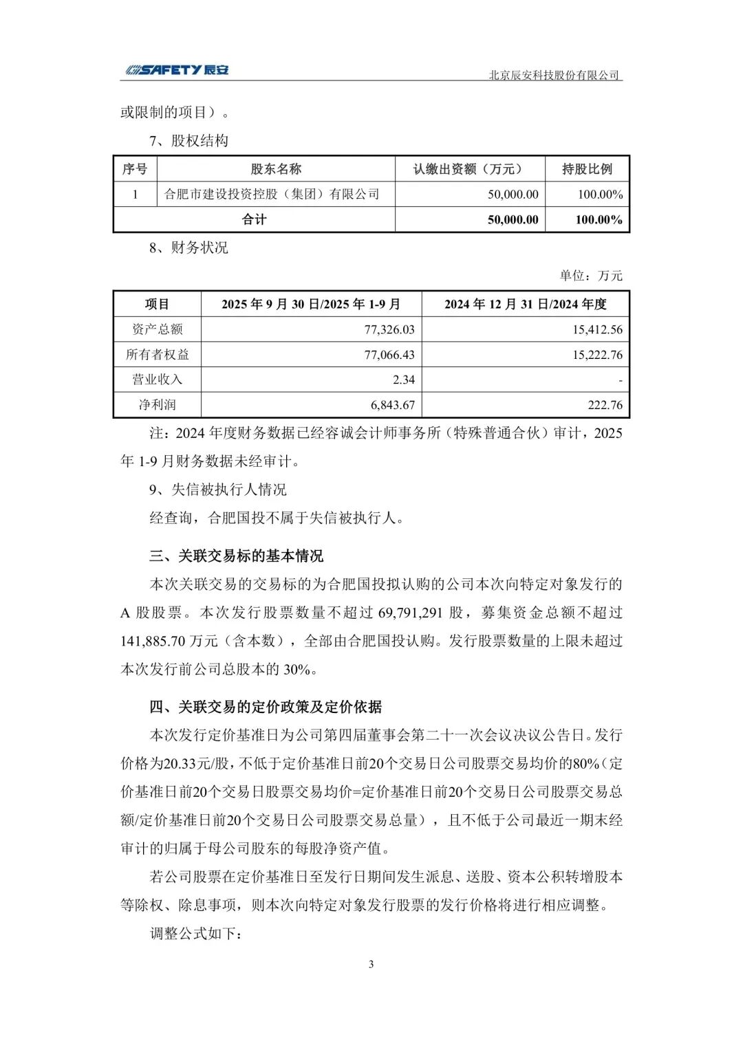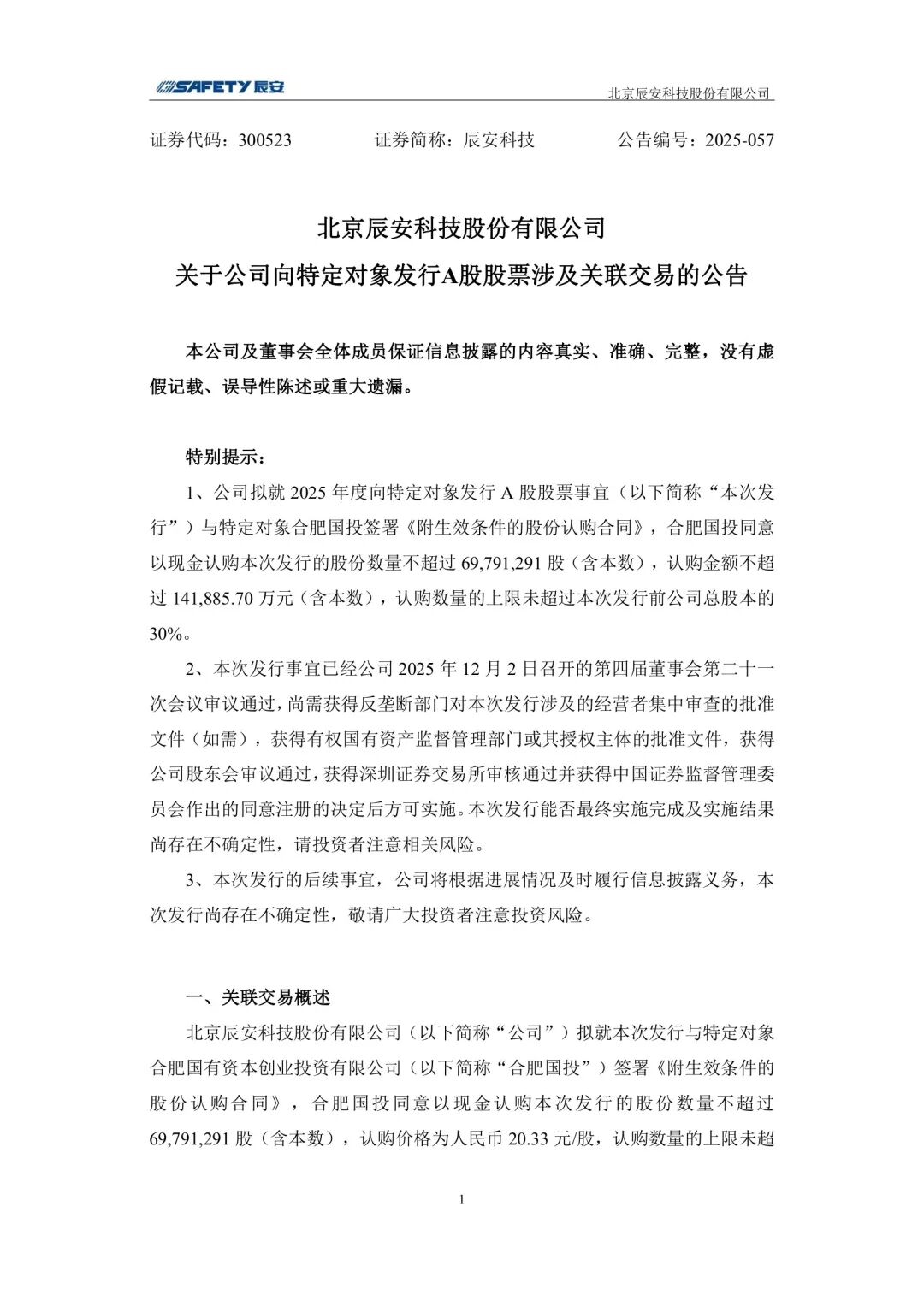 12月2日,辰安科技(300523.SZ)披露2025年度向特定对象发行A股股票预案。如本次定向增发股票事项获得相关审批并顺利实施,合肥市建投集团所属国投公司将以14.19亿元认购辰安科技股份,并最终以28.85%的持股比例成为控股股东。同时,在持股数量不变的基础上,中国电信将转型为辰安科技重要战略股东。建投集团将携手中国电信、联动清华大学合肥公共安全研究院,共同打造央地校协同新标杆,共筑国家公共安全产业发展新高地。