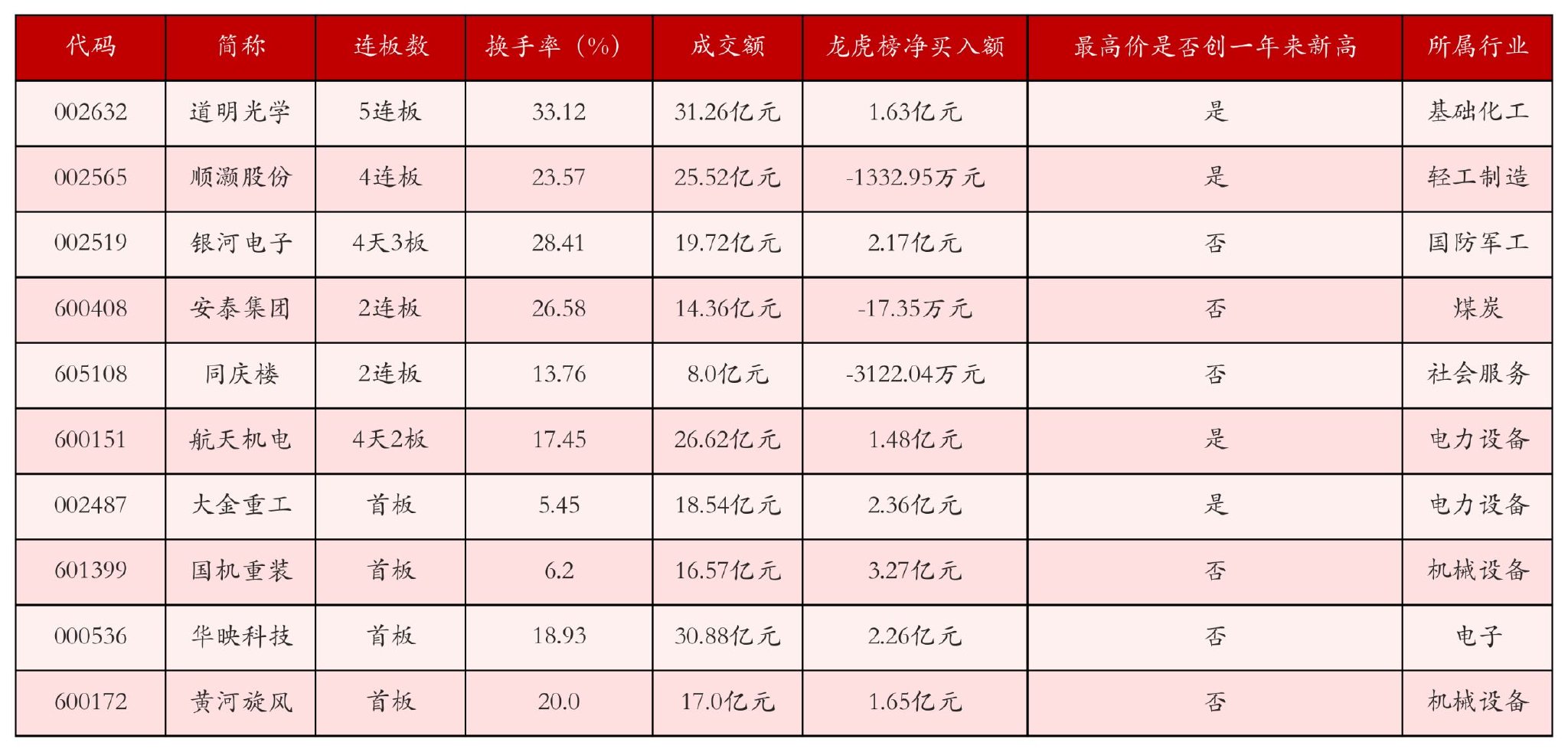 截至12月3日收盘,上证综指下跌0.51%,收于3878.0点,深证成指下跌0.78%,收于12955.25点,创业板指下跌1.12%,收于3036.79点。今日沪深两市A股共计54只涨停,综合当前连板数以及当日龙虎榜数据,其中较为强势的前三只个股分别为:道明光学(002632)、顺灏股份(002565)与银河电子(002519)。今日强势个股前10位具体数据见下表:
