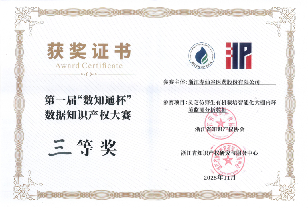 近日,由浙江省知识产权局指导,浙江省知识产权协会、浙江省知识产权研究与服务中心联合举办的第一届“数知通杯”数据知识产权大赛获奖名单正式公布。寿仙谷凭借参赛项目“灵芝仿野生有机栽培智能化大棚内环境监测分析数据”荣获大赛三等奖。