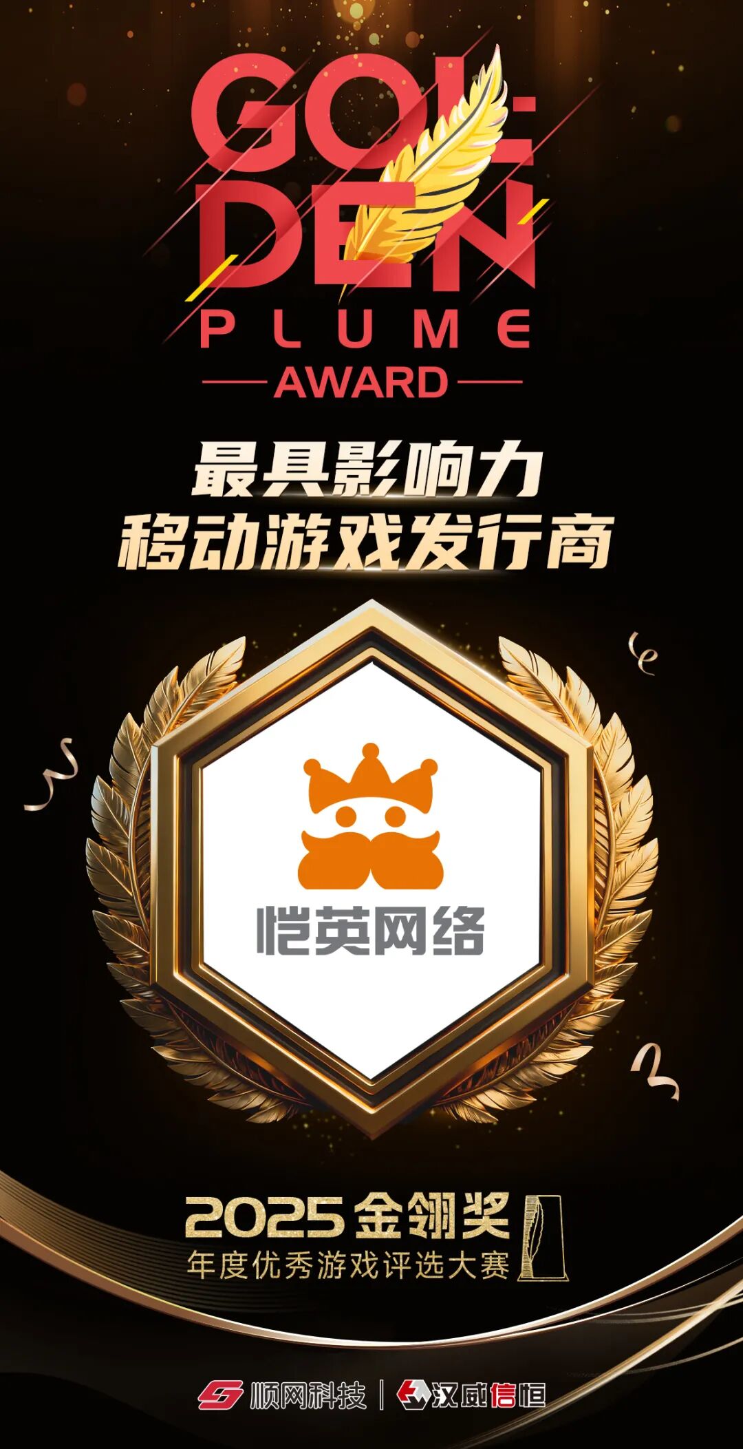 2025年12月3日,第二十届金翎奖暨2025年度优秀游戏评选大赛揭晓获奖结果,恺英网络凭借优秀的市场表现和玩家的高度认可,荣获“最具影响力移动游戏发行商”;旗下发行产品《热血江湖:归来》荣获“玩家最喜爱的移动网络游戏”奖;联合发行产品《龙之谷世界》荣获“玩家最喜爱的移动网络游戏”奖;自研自发产品《三国:天下归心》荣获“玩家最期待的移动网络游戏”奖。