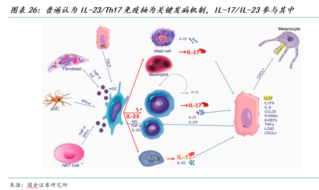 普遍认为IL-23/Th17免疫轴为关键发病机制,IL-17/IL-23参与其中。尽管银屑病的具体病因尚未完全明确,但目前认为遗传、免疫及环境因素共同参与其发病过程。遗传易感性是主要风险因素,其中IL-23/Th17免疫轴被视作关键发病机制。在该通路中,T细胞、树突细胞、中性粒细胞及角质形成细胞等通过释放TNF-α、IFN-γ、IL-17和IL-22等细胞因子,引发典型病理改变,包括中性粒细胞浸润及新生血管形成。活化的树突细胞分泌IL-12与IL-23,进而促使Th1、Th17及Th22细胞活化并释放更多炎症因子,形成自我放大的炎症循环。特别是IL-23可促进Th17细胞产生IL-17,而IL-17A在银屑病发生中作用最为显著。TNF-α则能增强多种炎症介质的表达,并放大IL-17的效应;IFN-γ可促进IL-23/Th17反应,而IL-15与IL-23共同参与Th17的活化。此外,IL-17A通过激活STAT1与STAT3信号通路,上调角蛋白K17的表达,提示针对K17通路的干预可能成为潜在治疗策略。