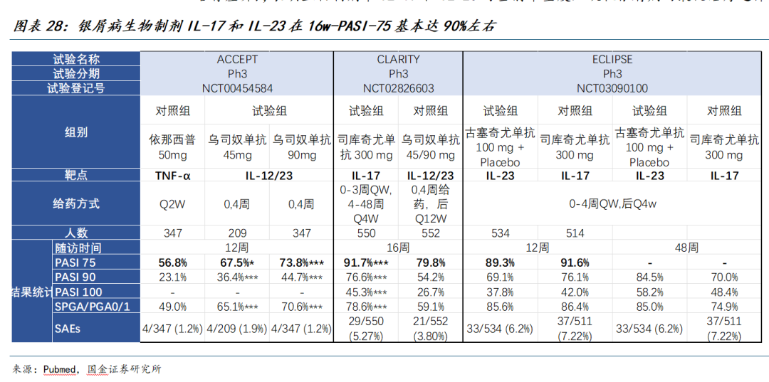 生物制剂中IL-17单抗和IL-23单抗疗效表现更佳,核心指标16w-PASI 75达标率均在90%左右。几款生物制剂头对头对比研究发现,IL-17和IL-23整体疗效较优,较IL-12/23和TNF-a在16周PASI-75疗效指标上均有显著提升,且基本均达到90%左右(部分研究略有差异),表明生物制剂中IL-17和IL-23为当前中重度斑块状银屑病的最优治疗选择。