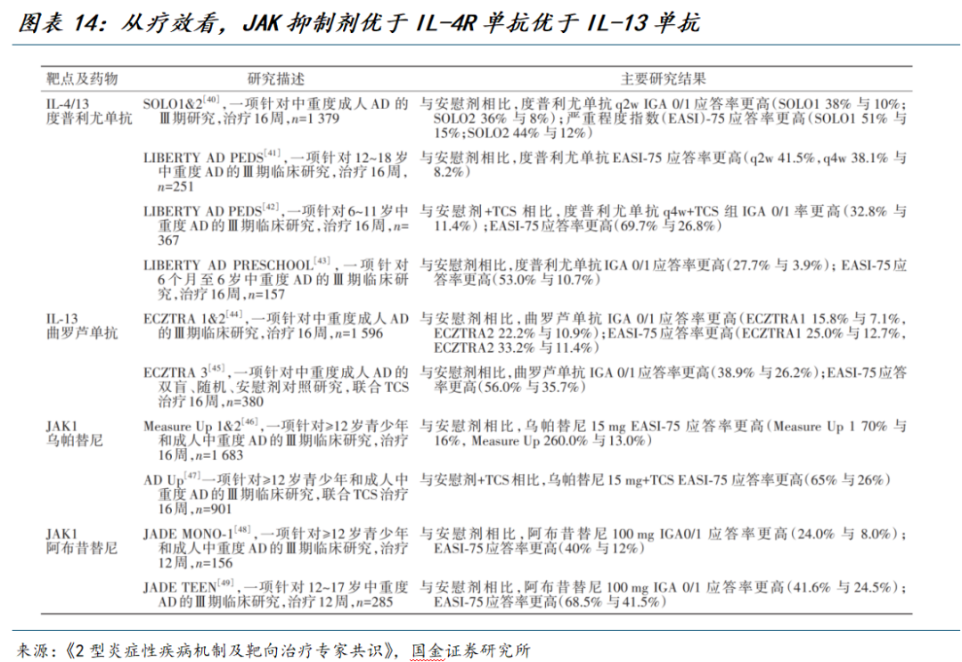 近年来小分子和生物制剂逐步上市,AD治疗迈入新阶段。传统疗法(如糖皮质激素、TCI等)安全性不佳,近十年来生物制剂和小分子靶向药等新兴产品逐渐涌现,目前新兴疗法上市产品不多,全球范围内约十余款不同作用机制的生物制剂和小分子靶向药物获批用于治疗AD,包括JAK、IL-4R、IL-13等靶点。JAK疗效好但存在安全性不佳(FDA为JAK抑制剂添加了黑框警告,存在致癌、心血管风险及感染风险),IL-13疗效不及IL-4R单抗,因此IL-4R目前为AD治疗的最优选择。