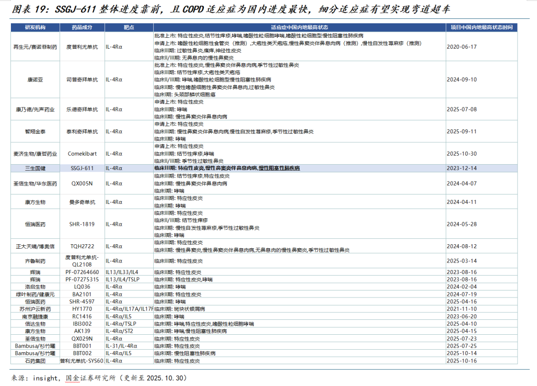 创新药物临床价值已获全球权威指南认可。2025版慢性阻塞性肺疾病(慢阻肺病)全球创议(GOLD)于2024年11月发布,针对近两年获批上市用于治疗慢阻肺创新药物,新版指南中多处更新了恩司芬群(ensifentrine)和度普利尤单抗相关信息。指南明确推荐,对于已使用二联长效支气管舒张剂的慢阻肺病患者,如仍有呼吸困难,可考虑加用恩司芬群(ensifentrine)。对于已使用LABA+LAMA+ICS仍有急性加重的慢阻肺病患者,如血嗜酸性粒细胞≥300个/μL且有慢性支气管炎症状,考虑加用度普利尤单抗。IL-4R单抗疗效逐步获得认可。SSGJ-611差异化抢先布局COPD适应症,目前已经进入临床III期,为国内进度最快企业,有望成为国内首个获批COPD的IL-4R单抗,实现细分适应症弯道超车。