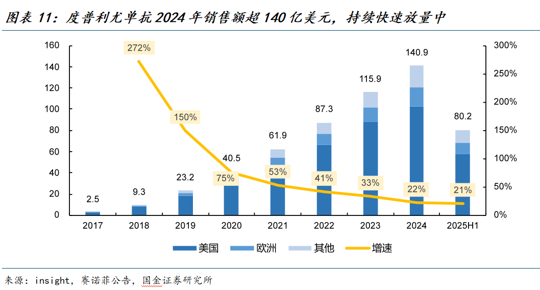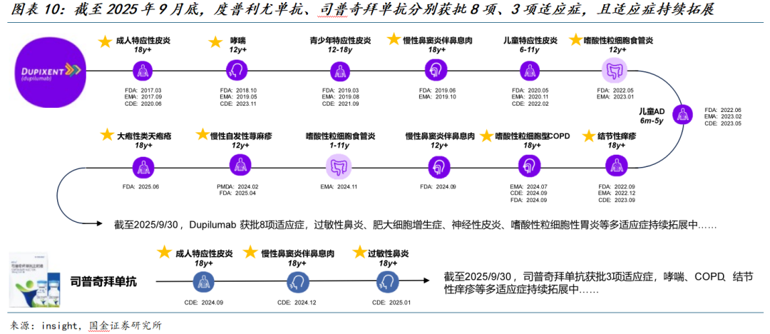 已上市IL-4R单抗全球销售额持续提升,且快速拓展适应症。目前全球范围共2款IL-4R获批上市,包括赛诺菲的度普利尤单抗和康诺亚的司普奇拜单抗,其中,度普利尤单抗2024年全球销售额超140亿美元(同比+22%),2025H1销售额超80亿美元(+21%),在高基数下仍处于快速放量阶段。度普利尤单抗首个适应症特应性皮炎于2017年在美国获批上市,此后陆续在全球范围内获批哮喘、慢性鼻窦炎伴鼻息肉、嗜酸性粒细胞型COPD等适应症,截至2025年9月底,全球范围已获批8项适应症。司普奇拜单抗于2024年9月在国内获批上市,截至2025年9月底已经获批包括AD在内的三项适应症。