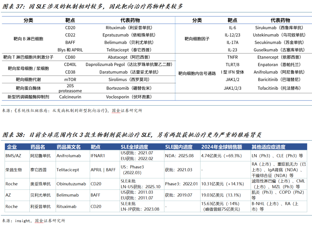 SLE的传统治疗以泛靶点抗炎和免疫抑制药物为主,近年来生物制剂为SLE治疗提供了新手段。SLE发病机制复杂,近年来随着研究进一步深入,普遍认为参与SLE最主要的通路为细胞因子信号通路、IFN-α/β信号通路、TLR信号通路以及T、B淋巴细胞受体信号通路。这些关键细胞及通路也成为靶向治疗研究的重要方向。目前全球范围内已有针对SLE的3款生物制剂获批上市,分别为贝利尤单抗、泰它西普、阿尼鲁单抗;利妥昔单抗及奥妥珠单抗针对狼疮肾炎适应症获批,但尚未批准SLE适应症。