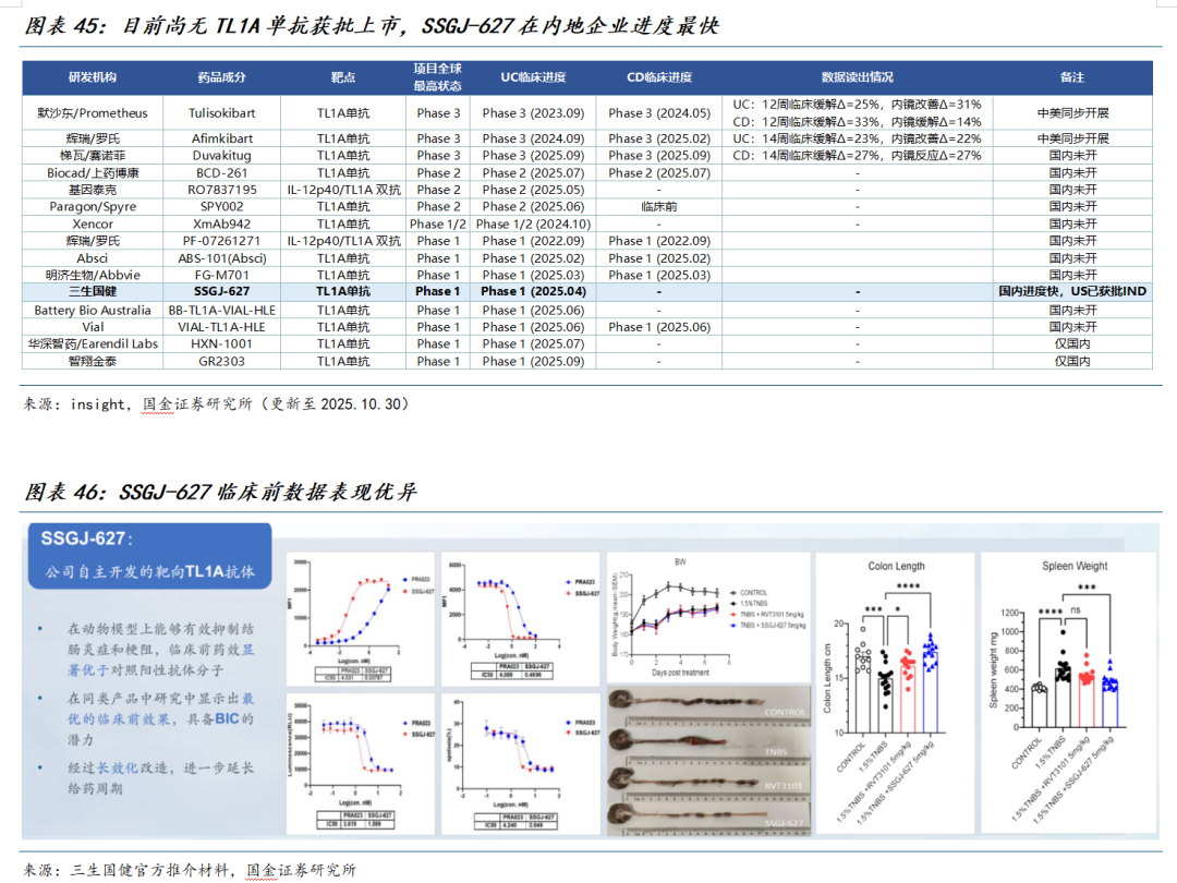 SSGJ-627临床前数据优异,国内进度靠前。目前全球范围内暂无TL1A单抗/双抗获批上市,SSGJ-627在国内临床进度靠前,为国产企业进度第一,国内进度顺位第三。SSGJ-627临床前数据优异,在动物模型上能够有效抑制结肠炎症和梗阻,临床前药效显著优于对照阳性抗体分子,在同类产品中研究中显示出最优的临床前效果,具备BIC的潜力;经过长效化改造,有望进一步延长给药周期。