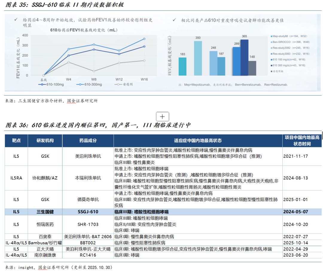 610临床II期疗效数据积极,给药后4~8周即开始起效,试验药物FEV1改善始终较安慰剂组更明显,且相比同类产品610对重度哮喘受试者肺功能改善更佳。目前治疗重度嗜酸性粒细胞哮喘III期进行中(2024年5月已进入III期临床),国产同靶点研发进度第一,整体竞争格局较好,后续上市后有望快速贡献收入。