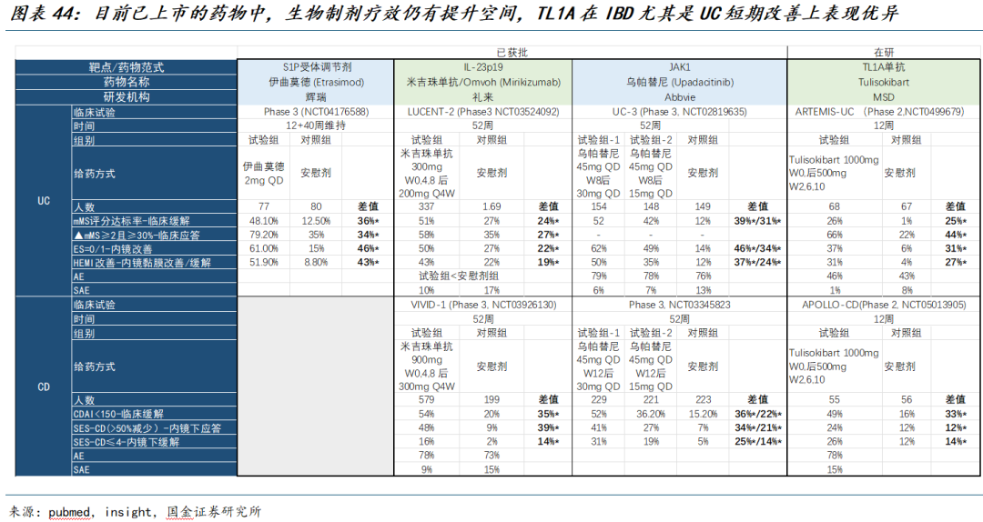 目前已有多款药物获批IBD,TL1A单抗II期数据优异,有望成为新一代IBD潜力靶点。目前全球范围内有多款生物制剂和小分子药物针对IBD适应症获批上市,包括:①小分子药物:JAK抑制剂(乌帕替尼、非戈替尼等)、SIP抑制剂(伊曲莫德、奥扎莫德等),②生物制剂:TNF-α单抗(阿达木单抗等)、IL-23p19(米吉珠单抗等)。小分子药物以JAK为代表,存在黑框警告,安全性不佳。生物制剂中IL-23p19单抗整体疗效仍有改善空间。在研的TL1A单抗II期临床在短期IBD临床和内镜改善下展现出优异疗效(尤其是UC),有望成为新一代IBD潜力靶点。