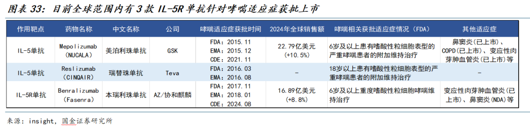 目前全球范围内已有三款IL-5单抗针对哮喘适应症获批上市,分别是GSK的美泊利珠单抗、Teva的瑞替珠单抗以及AZ的本瑞利珠单抗。其中本瑞利珠单抗2024年全球销售额约17亿美元,美泊利珠单抗销售额超22亿美元,销售额仍持续增长。