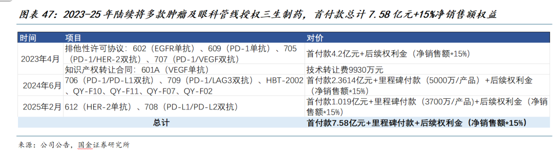 聚焦自免主业,肿瘤等非自免管线授权母公司三生制药。2023-2025年,公司持续聚焦自免主业,陆续与母公司三生制药达成协议,将肿瘤及眼科管线授权/转让给三生制药,包括SSGJ-707、SSGJ-706、601A等多个项目,累计总首付款达7.58亿元,且除601A外,所有资产均保留后续权利金(即净销售额15%)。截至2024年底,累计确认授权收入1.65亿元(2023年0.99亿元+2024年0.66亿元),尚有约6亿元授权收入暂未确认,后续陆续确认后有望短期贡献利润。