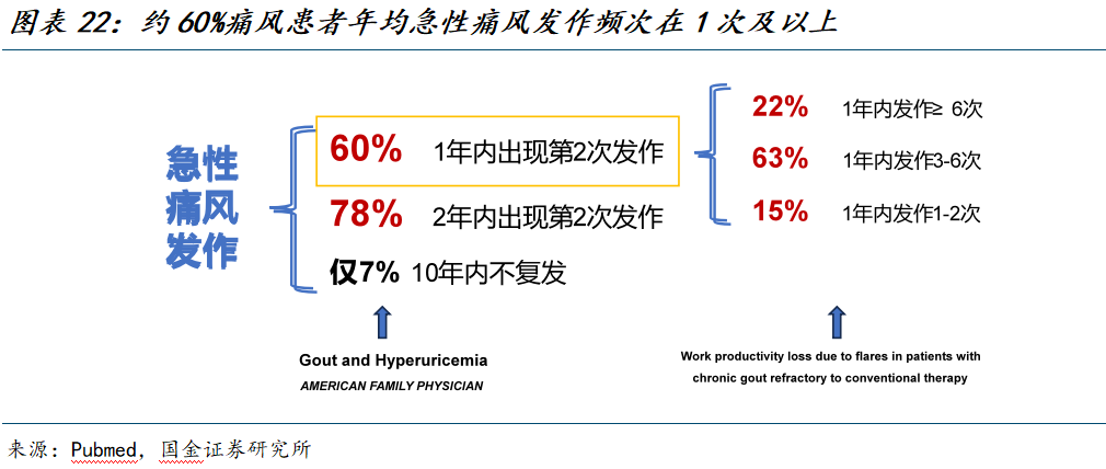 约60%的患者1年内会出现第二次发作。根据《Gout and Hyperuricemia》,约60%的患者在第一年内出现第二次发作。美国一项研究显示,近一年有痛风复发的110例患者中,近15%一年内有1-2次痛风急性发作,63%有3-6次急性发作,22%有6次以上急性发作。可见痛风急性发作往往较为反复,且大部分年均发作频率较高。