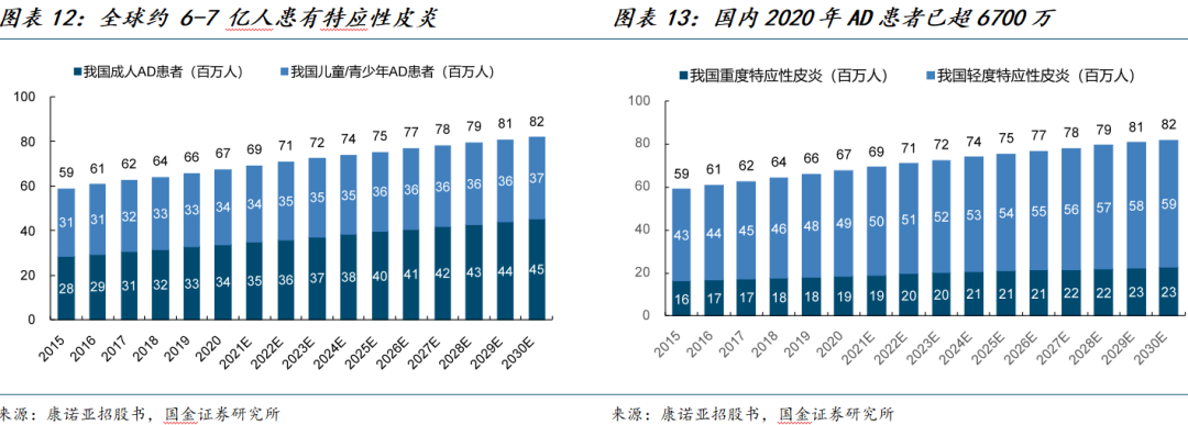 特应性皮炎以瘙痒作为重要标志,患者人群众多,疾病负担较重。特应性皮炎(AD)是一种慢性、复发性、炎症性皮肤病,其特点为:反复发作、病程迁延,患者往往有剧烈瘙痒。影响日常生活,患者就诊意愿强烈,亟需疗效优异、安全性良好的药物。AD患者人数众多,全球约6~7亿患者、国内约6700万患者,其中中重度患者约30%,约2000万中重度患者,未满足需求巨大。