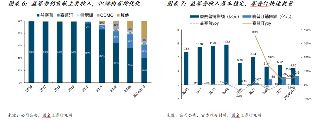 赛普汀于2020年6月获批上市,2020年12月底,赛普汀通过了医保谈判,首次被纳入《国家医保目录》。上市以来,已被纳入多项诊疗指南和专家共识:根据《中国临床肿瘤学会(COSO)乳腺癌诊疗指南》,伊尼妥单抗(赛普汀)作为晚期乳腺癌患者全程抗HER2治疗的基础药物。随着赛普汀在临床应用的增加,赛普汀的治疗价值被越来越多的医生和患者认可,产品认可度提高带来销售增量;医院准入工作持续推进,更多终端实现药品可及;同时由于疗效优秀,给患者带来持续获益,患者用药周期增加,上述因素带动赛普汀的销售收入同比大幅增加。2024Q1-3赛普汀销售额约2.6亿元(+53.5%),考虑到整体基数增加以及院内环境影响,预计2025年赛普汀收入持续稳健增长。
