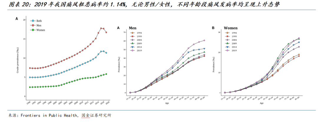 2019年我国痛风患者约1620万人,粗患病率约1.14%,且发病率呈现逐年上升态势。痛风是由尿酸钠晶体(monosodium urate,MSU)沉积在关节和非关节结构引起的一种常见疾病,可表现为剧烈疼痛的急性关节炎反复发作以及痛风石形成,严重者可致关节畸形、肾功能不全等重要脏器损害。根据2022年发表的针对1990-2019年我国痛风患者的meta分析研究,2019年我国痛风患者约1620万人,粗患病率约1.14%,且发病率呈现逐年上升趋势。