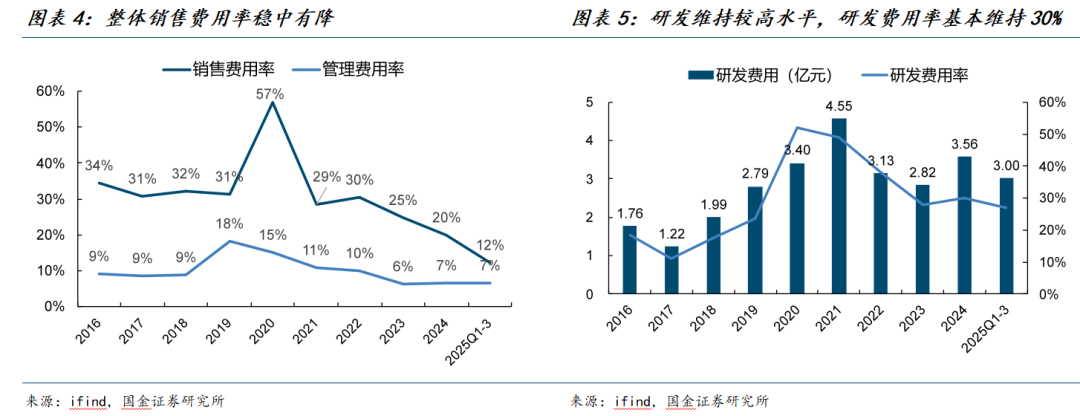 费用控制整体良好,研发投入维持稳步增长。近几年销售费用率有所下降,管理费用基本维持稳定,主要得益于公司持续优化,2025年前三季度销售费用率仅12%,预计除持续优化销售团队外还有营业收入的提升影响。公司2018年起逐步加强研发费用投入,2021年研发费用达4.55亿元,近几年随着不同管线的临床进度,整体研发费用略有调整,但基本维持较高水平,研发费用率基本维持30%左右。