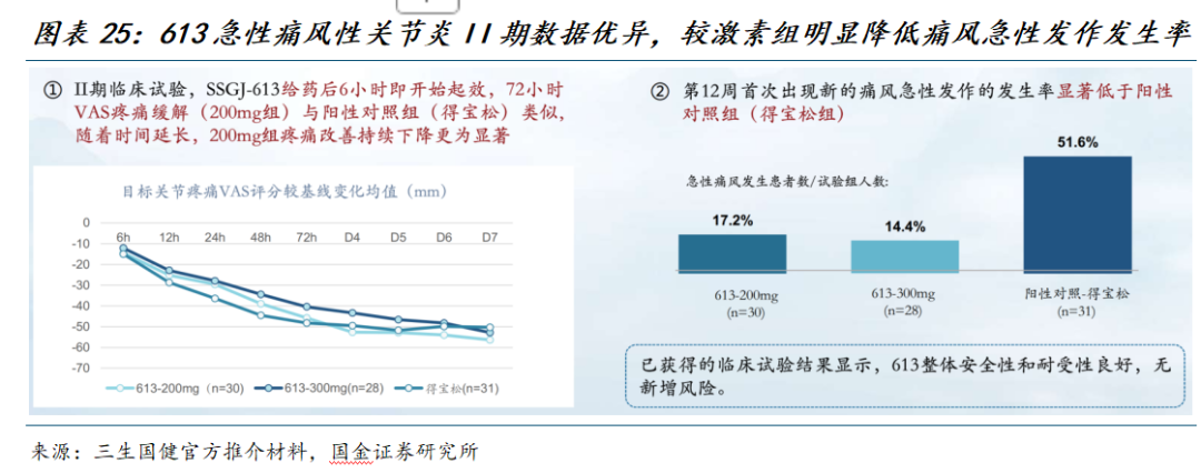 目前全球范围有多款IL-1相关产品上市,但仅2款IL-1β单抗获批急性痛风性关节炎适应症,SSGJ-613已IL-1于递交NDA,有望成为全球第三款、国内第二款获批针对急性痛风性关节炎的IL-1β单抗。II期临床数据显示,与阳性对照组得宝松相比,疼痛缓解程度基本类似,随着时间延长,200mg SSGJ-613组疼痛改善持续下降更为明显,613还可显著降低急性痛风发作率(300mg-611组14.4% vs 激素组51.6%),且同时具备较好的疗效和安全性。