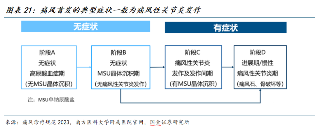 急性痛风性关节炎是痛风典型的首发症状,起病急、疼痛难忍,患者诊疗意愿强烈。根据欧洲抗风湿病联盟,可将痛风的病程分为临床前期(无症状高尿酸血症和无症状MSU晶体沉积)和临床期(即痛风期,分为痛风性关节炎发作期及发作间期、慢性痛风石病变期)。痛风的典型首发症状是急性痛风性关节炎(即痛风急性发作,Acute Gout,AG),起病急骤,疼痛进行性加剧,12h左右达高峰,疼痛呈撕裂样、刀割样或咬噬样,难以忍受;关节及周围软组织出现明显的红肿热痛,多于数天或2周内自然缓解。缓解后会进入无痛无症状期(发作间歇期),而后若尿酸控制不佳又可能进入急性发作期,多数患者在初次发作后1~2年内复发,随着病情进展,发作频率逐渐增加,发作持续时间延长。
