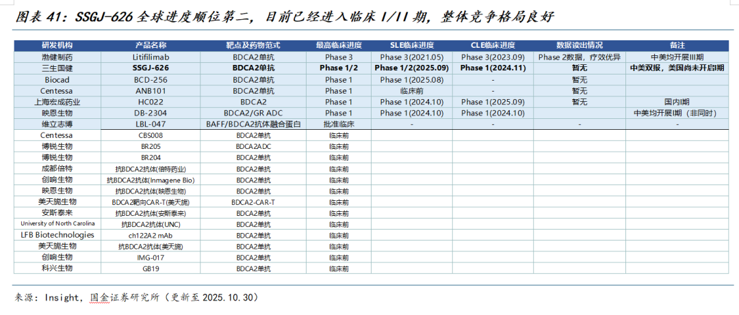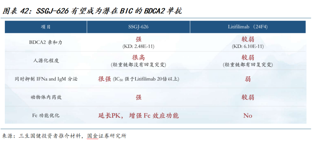 SSGJ-626全球进度顺位第二,目前已经进入临床I/II期,整体竞争格局较好。截至2025年10月28日,全球范围内共6款BDCA2靶点相关药物进入临床阶段,其中SSGJ-626进度顺位全球第二,仅次于渤健。临床前数据表明,SSGJ-626对BDCA2的亲和力强(KD=2.48×10-11),且人源化程度高(轻重链均没有回复突变),且可以同时抑制IFNα和IgM分泌(IC50强于Litifilimab 20倍以上),Fc段进行强化,延长期PK并增强Fc效应功能,具备BIC潜力。