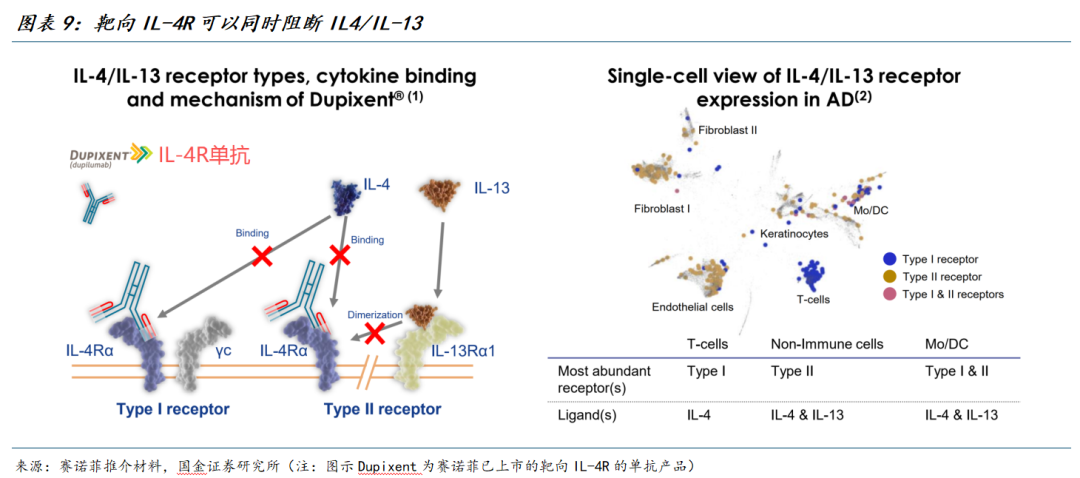 普遍认为IL4/IL-13是2型炎症反应的关键因子,而靶向IL-4R可以同时阻断IL4/IL-13。IL-4和IL-13通过两种潜在的异二聚体受体(I型和II型受体复合物)传递信号,这两种受体具有共同的受体亚基——IL-4受体α链(IL-4Rα)。IL-4Rα与γ链结合,形成用于IL-4信号传导的1型异二聚体,该受体主要在造血细胞(如淋巴细胞、单核细胞、巨噬细胞)上表达。2型受体复合物由IL-4Rα与IL-13Rα1结合形成,IL-4或IL-13均可激活该复合物。2型异二聚体在非造血细胞中表达更为广泛,如角质形成细胞、毛囊、表皮皮脂腺、汗腺、上皮细胞、平滑肌细胞和成纤维细胞。