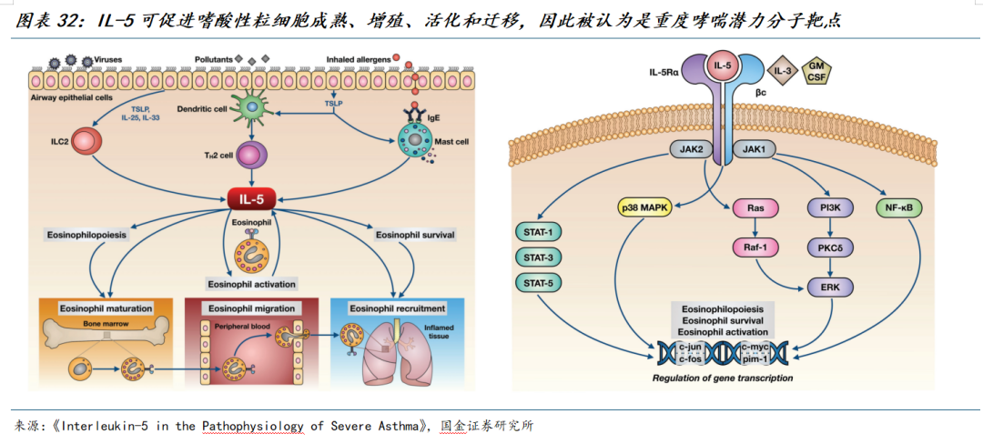 嗜酸性粒细胞分化、增殖、活化、存活和募集至气道的最重要生物学因子是IL-5。IL-5由多种细胞产生,包括Th2淋巴细胞、2型固有淋巴细胞(ILC2)、肥大细胞和嗜酸性粒细胞。这些细胞在吸入性过敏原、呼吸道病毒和空气污染物等多种环境刺激激活后释放IL-5。IL-5与IL-5Rα结合,从而诱导其与βc亚基相互作用,并激活由JAK1/2-STAT1/3/5模块、p38和ERKMAP激酶以及NF-κB转录因子组成的复杂细胞内信号网络。随后,特定靶基因的激活导致嗜酸性粒细胞的成熟、存活和活化,并促进其从血液迁移至气道以及募集至气道。因此,IL-5在哮喘的病理生理学中起着关键作用,IL-5及其受体也被认为是重症哮喘生物疗法的较有潜力的分子靶点。