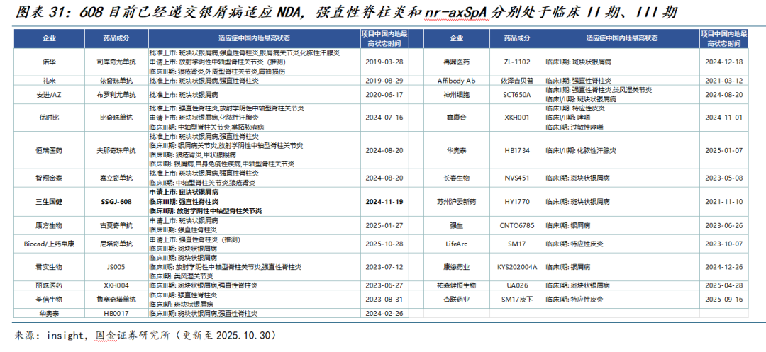 608目前银屑病适应症已经递交NDA,强直性脊柱炎和nr-axSpA分别处于临床II期、III期。2024年11月,公司已经递交银屑病适应症NDA,有望2026年获批上市;强直性脊柱炎III期临床持续入组中;放射学阴性中轴型脊柱炎临床II期已达主要终点,结果积极,有望快速推进III期临床。产品一旦上市,有望借助公司现有渠道优势,实现销售快速放量,有望实现优异的商业化表现。