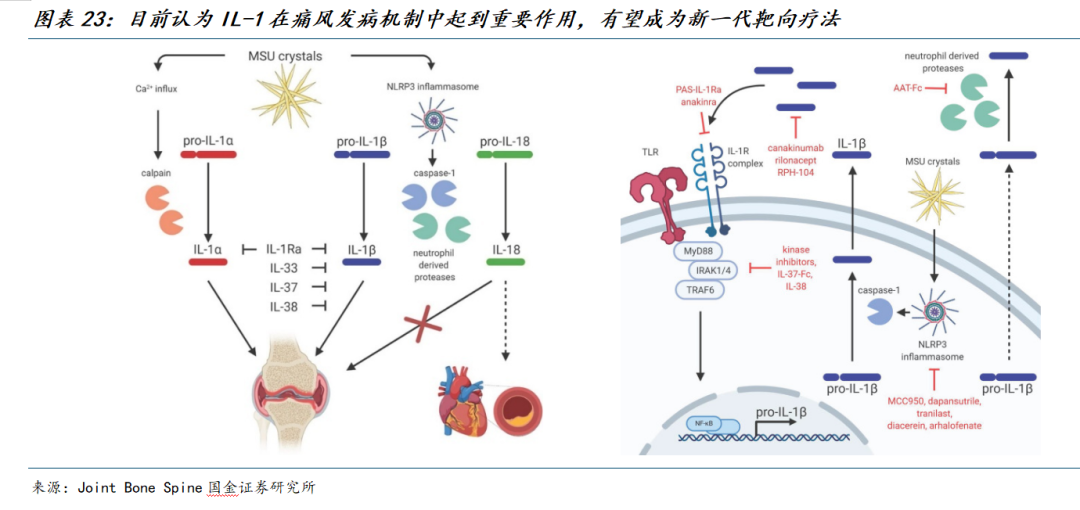 目前认为IL-1在痛风发病机制中起到重要作用,有望成为新一代靶向疗法。目前普遍认为急性痛风性关节炎的发病机制为:MSU晶体激活NLRP3炎症体介导的炎症通路,导致促炎细胞因子IL-1的释放并启动炎症反应。IL-1β作为先天免疫应答的有效介质,是痛风性关节炎急性发作时的关键促炎因子。针对IL-1的抑制剂在痛风性关节炎的治疗中或有着显著的疗效。